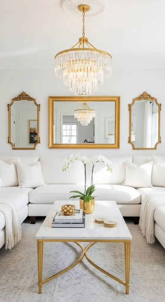 White and gold never go out of style. White walls and upholstery set the tone, and gold pops up in frames, mirrors, or even a luxe chandelier. Think “hotel suite chic.”