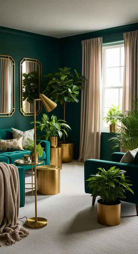 Emerald green screams confidence. Add brass finishes (like side tables or lamp bases) and you’ve got a space that feels opulent without trying too hard.