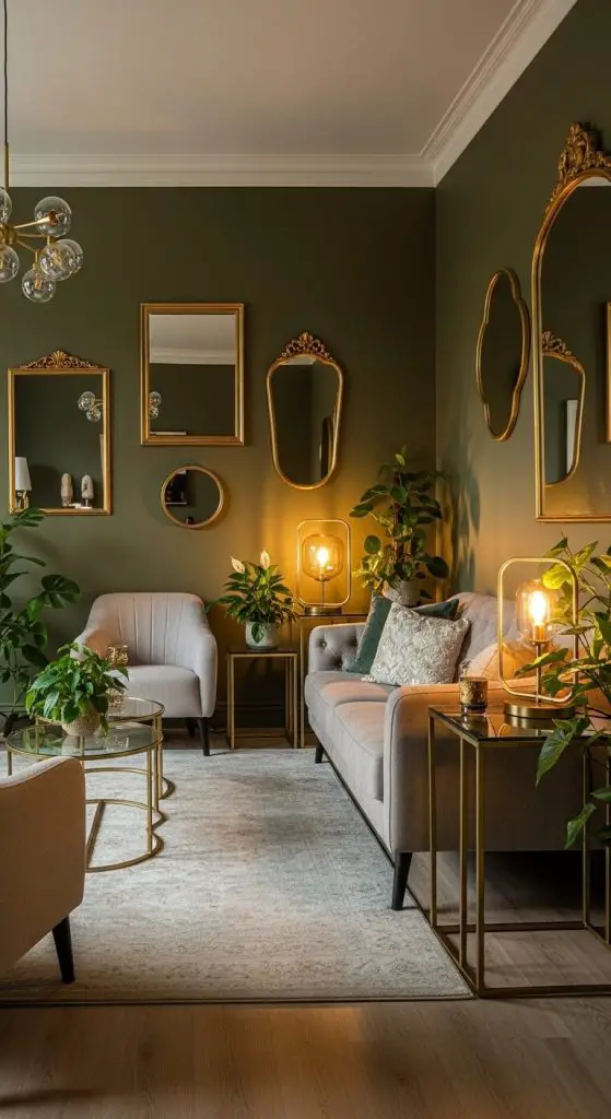 Personal take: I once tried this combo in my own living room—plants + olive walls + golden frames = compliments every time.