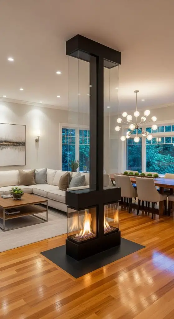 Want a fireplace that works from multiple angles? Double-sided fireplaces create separation while connecting spaces. Perfect for open-concept homes.