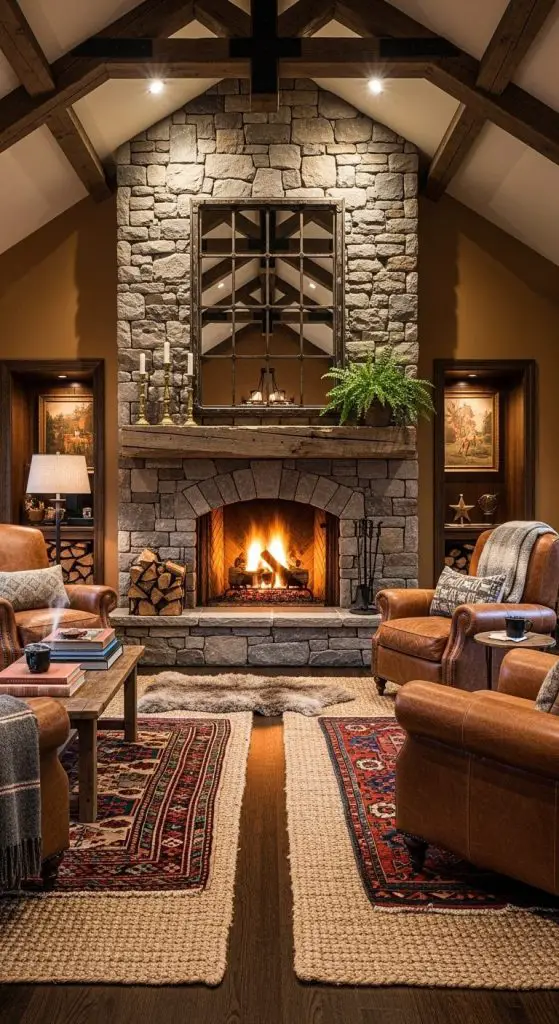 For those who love warmth and texture, a stone fireplace adds character. Rough-hewn stones or stacked limestone give a cabin-meets-luxury feel.