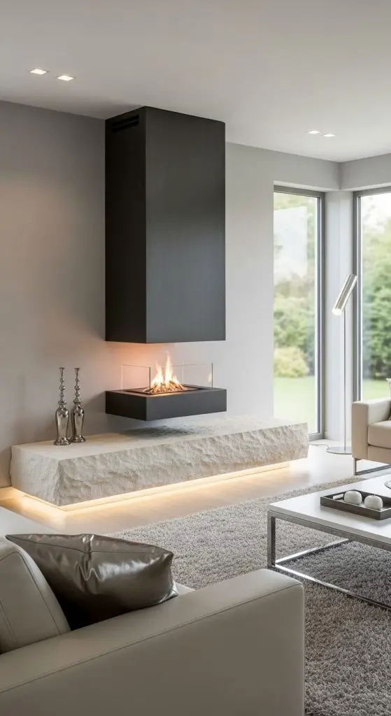 For a sleek, contemporary look, a floating fireplace appears suspended off the floor. This design emphasizes lightness and modernity.