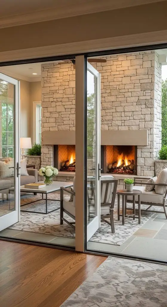If you love indoor-outdoor flow, consider a fireplace that connects your living room to the patio. Double-sided or pass-through designs create continuity.