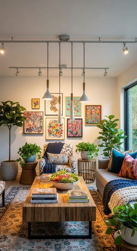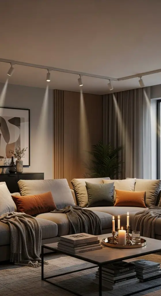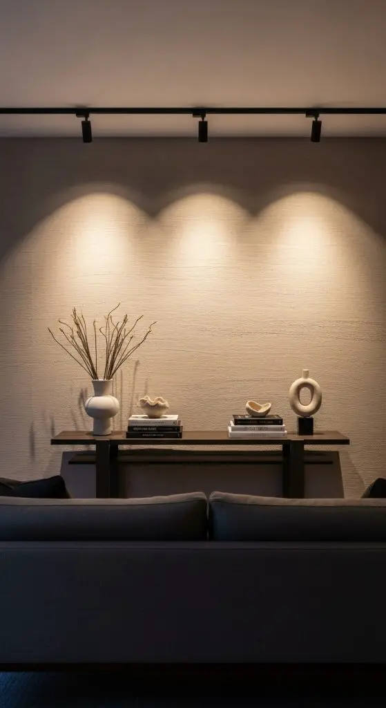 Bookworms, this one’s for you. Direct track lights onto shelves for that warm library glow. Suddenly your living room screams intellectual chic.