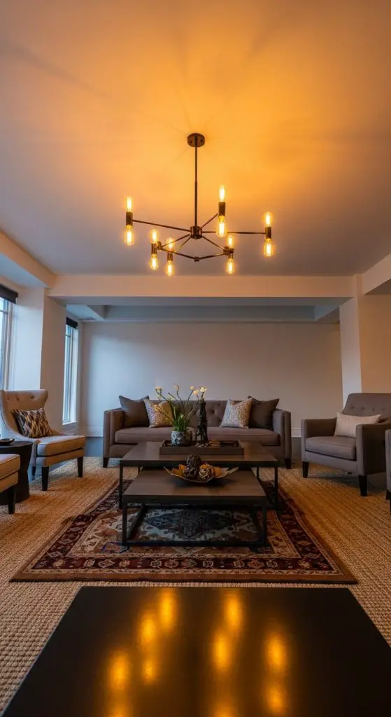 Chandeliers aren’t just for dining rooms. A modern chandelier with warm bulbs can make your living room feel elegant without going over the top.