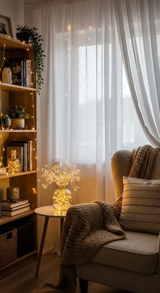 Now don’t roll your eyes. Fairy lights aren’t just for dorm rooms or holiday décor. If you use warm-white fairy lights and drape them creatively—around a bookshelf, behind sheer curtains, or inside a large glass vase—they can look downright magical.