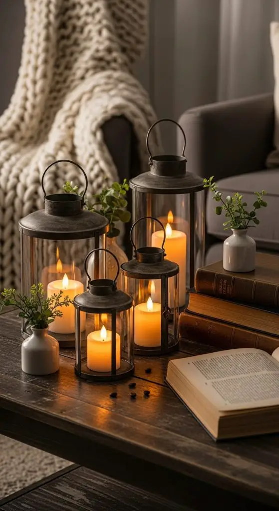 Okay, nothing screams “warmth” more than a few candles or lanterns. Whether you prefer real flame or flameless LED versions, they deliver instant charm.