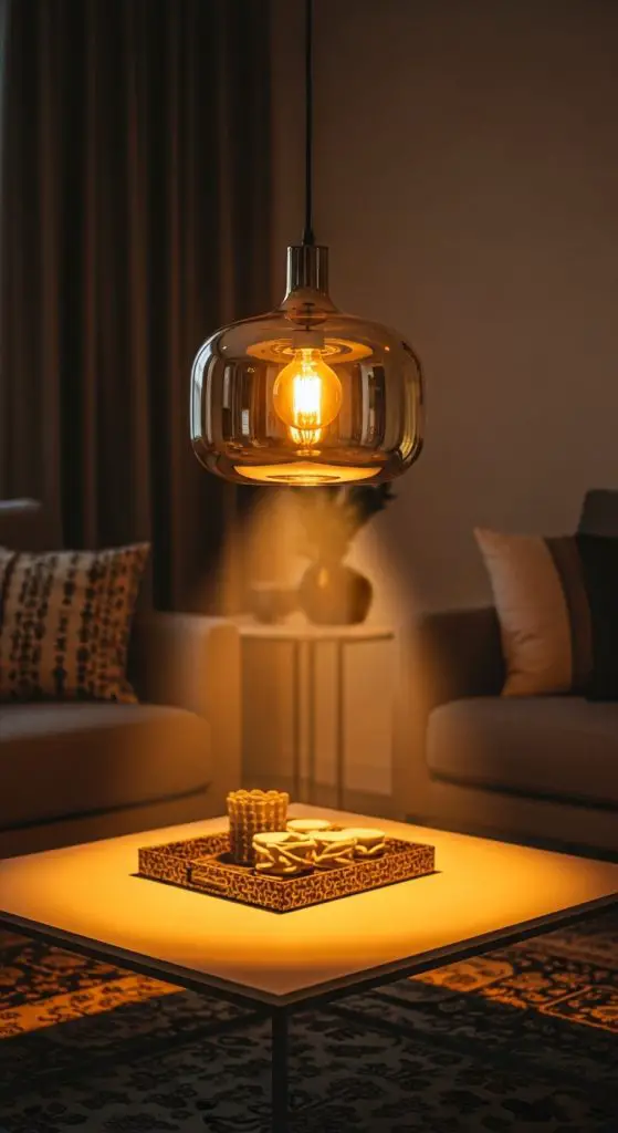 Pendant lights aren’t just for kitchens. A single or cluster pendant with a warm bulb over your coffee table looks stylish and practical.